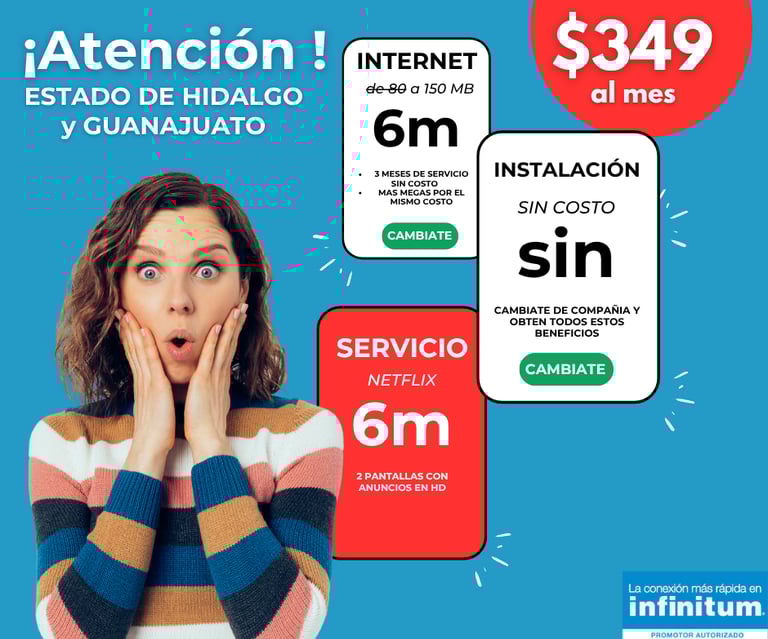 Más velocidad al mismo precio: De 80mb a 150mb, ¡sin pagar más! por 6 meses ejemplo paq $349.00 Solo internet. Residencial o negocios.